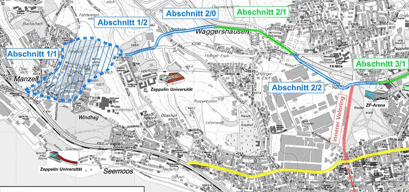 Damit die Abschnitte 2/0 und 2/1 aus Osten erreicht werden, fehlt der Abschnitt 2/2 ab dem Colsmanknoten, der nördlich der ZF entlang geplant ist. Hier ist die Stadt von der ZF abhängig, da die Trasse auf und am Rande des Werksgeländes verläuft und nur im Zusammenhang mit Baumaßnahmen der ZF umgesetzt werden kann.