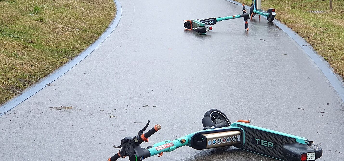 Nicht selten liegen Leih-E-Scooter auf Wegen herum, wie hier auf dem Veloring, statt sorgsam dort abgestellt zu werden, wo sie niemanden stören oder gefährden. © Bernhard Glatthaar