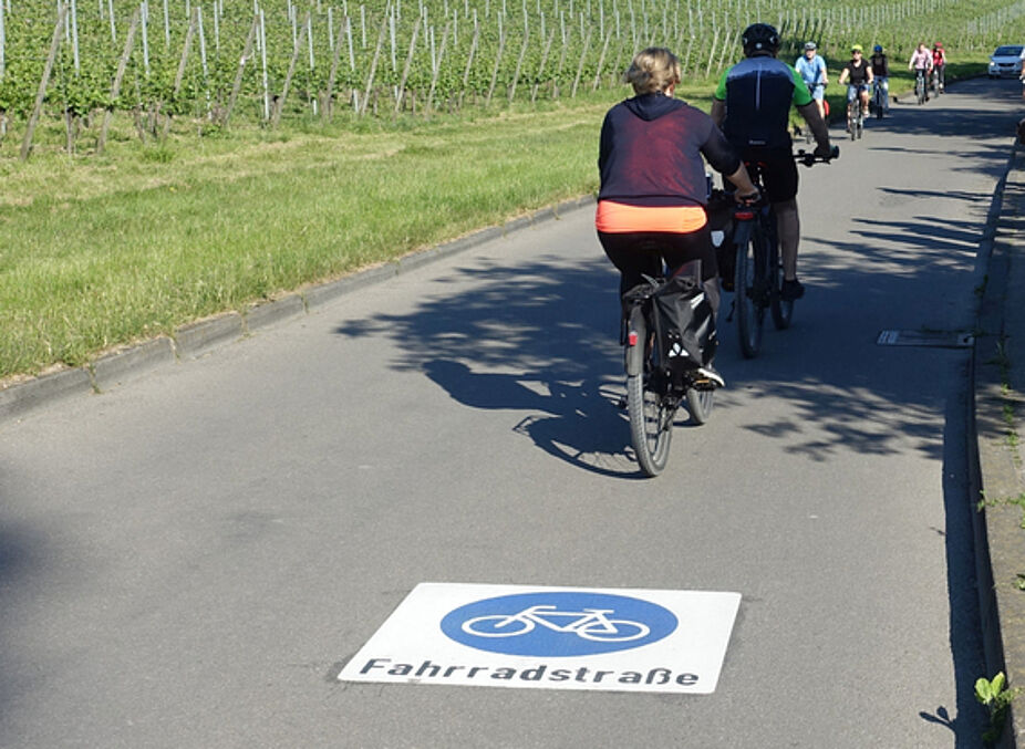 Leider wurden auch auf dieser neuen Fahrradstraße die Markierungen des Fahrradstraßen-Verkehrszeichens viel zu klein ausgeführt. Der ADFC hatte bereits bei der 2019 eingeweihten Fahrradstraße zwischen Hagnau und Kirchberg darauf hingewiesen, denn die Musterlösungen des Verkehrsministeriums Baden-Württemberg schreiben eine Größe der Fahrradstraßen-Markierung von mindestens 2,0 Metern vor.