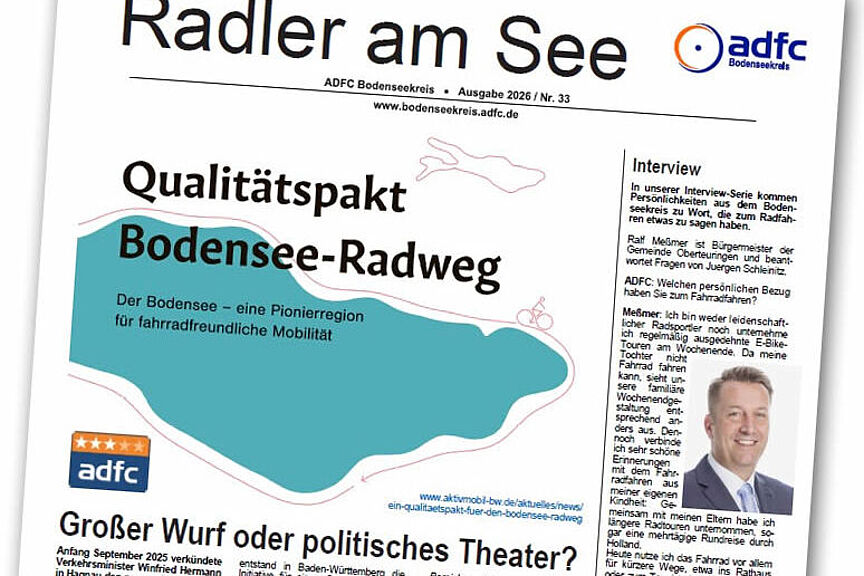 Die Jahreszeitschrift „Radler am See“ berichtet in der Ausgabe 2026 über die wichtigsten Themen zum Radverkehr im Bodenseekreis und bei unseren Nachbarn in Konstanz und Ravensburg. Zahlreiche Berichte zeigen das Engagement des ADFC und die Lobbyarbeit in der Kommunalpolitik. Die Zeitschrift steht hier auf der Website zum Download zur Verfügung und ist auch im ADFC-Infoladen als Heft erhältlich.