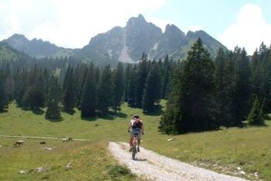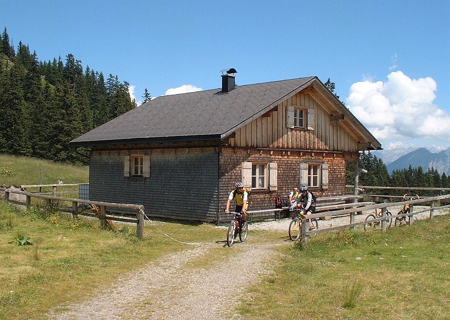 Nach einer kurzen Abfahrt vom Klampersätteli erreicht man die schön gelegene Furkla-Alpe (17,3 km, 1595 m), die eine einfache Brotzeit und Getränke anbietet, aber leider nicht immer geöffnet ist. Die Weiterfahrt unterhalb der Mondspitze und des Schillerkopfes geht zunächst meist eben am Hang entlang, dann flott bergab zur Inneren Parpfienz-Alpe (23,7 km), wo für Milch- und Käseliebhaber schon wieder eine Einkehr lockt. Die anschließende Abfahrt nach Brand auf der zum Teil ruppigen Schotterpiste mit vielen Kehren macht richtig Spaß, sollte aber mit der nötigen Vorsicht befahren werden, denn es sind auch Wanderer anzutreffen. Bitte aufpassen und stets bremsbereit sein.