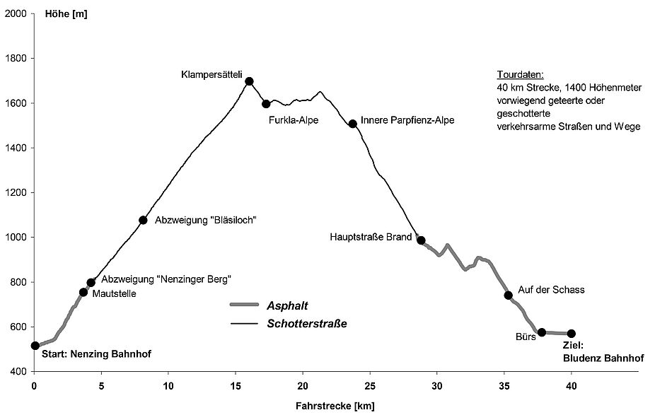 Bei der Einmündung in die Hauptstraße in Brand (28,6 km, 991 m) hat uns die automobile Zivilisation wieder, aber nach 200 m Fahrt auf der Hauptstraße talauswärts geht’s bereits wieder rechts ab, Schilder zeigen nach Bürs und einem Golfplatz. Kurz danach führt ein Treppenweg steil hinab zur Brücke über den Alvier-Bach, der fortan immer links von uns durchs Tal fließt. Es geht entlang des Golfplatzes, kurz auf Schotter, später nur noch auf Asphaltwegen im Wald talauswärts, wo wir noch zwei kurze Anstiege fahren müssen. Danach führt die Straße verkehrsarm genussvoll bergab Richtung Bürs, wo „Auf der Schass“ nach 35,3 km (740 m) die Abzweigung links nach Bürs zu beachten ist. Bis Bürs (37,9 km) ist der Weg nicht zu verfehlen, und nach insgesamt ca. 40 km erreicht man auf der Hauptstraße den Bahnhof in Bludenz.